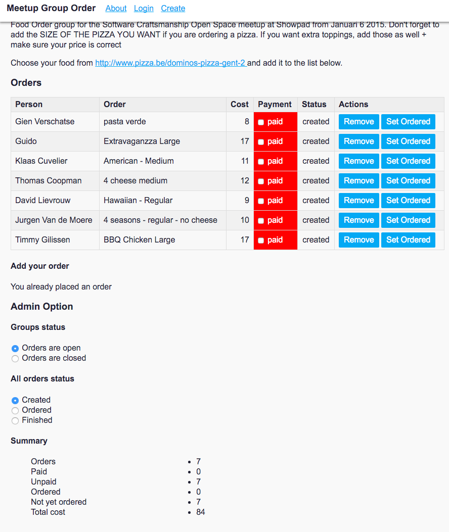 Once I had basic functionality to create groups and add orders to groups I could start adding in some "administration" functionality (order statuses, payment statuses,…) and some quick wins for the people ordering (remembering the groups they visited, removing orders,…)